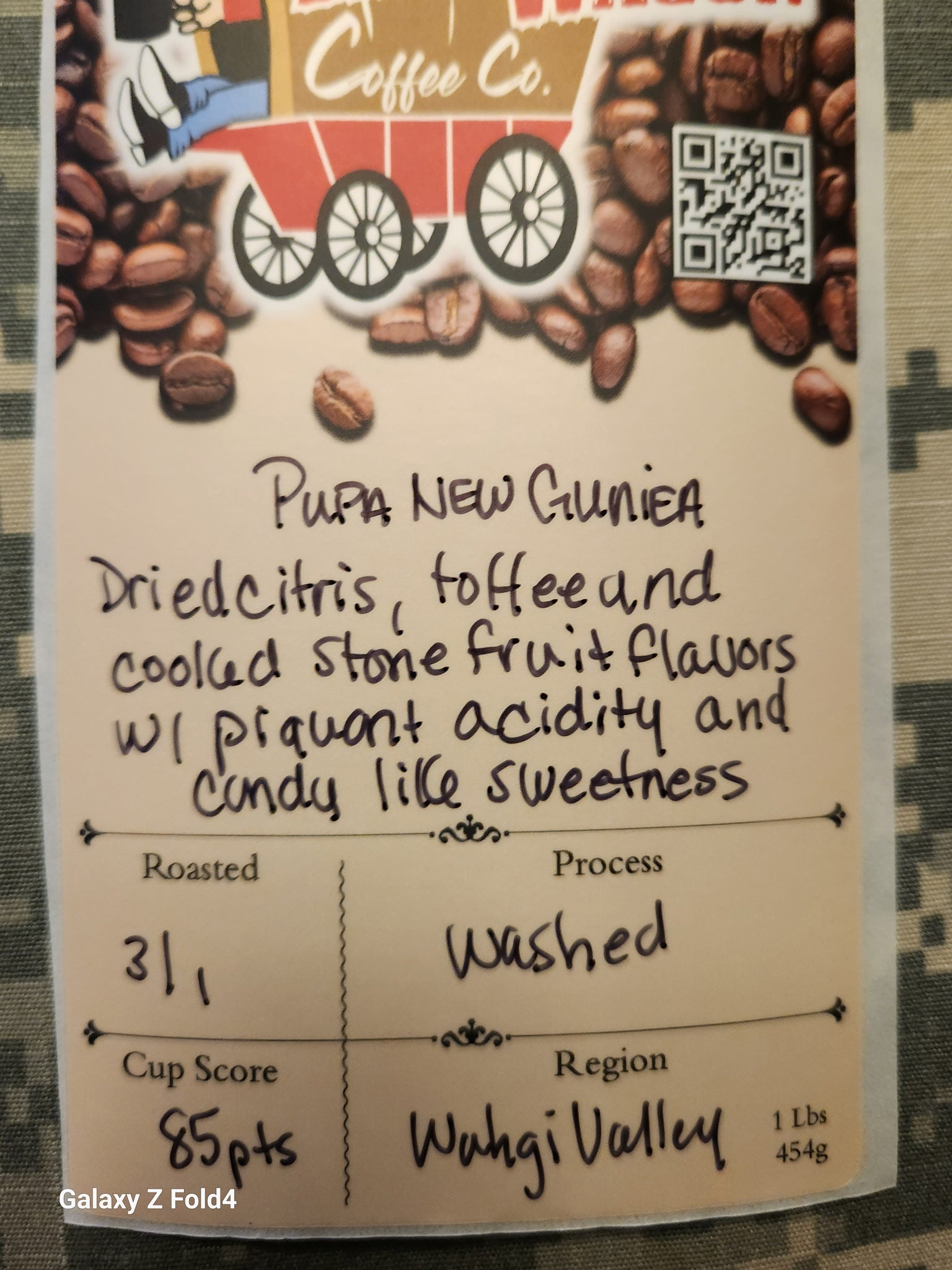 Papua New Guinea dried citris, toffee and cooked some fruit flavors w/ piquant acidity and candy like sweetness